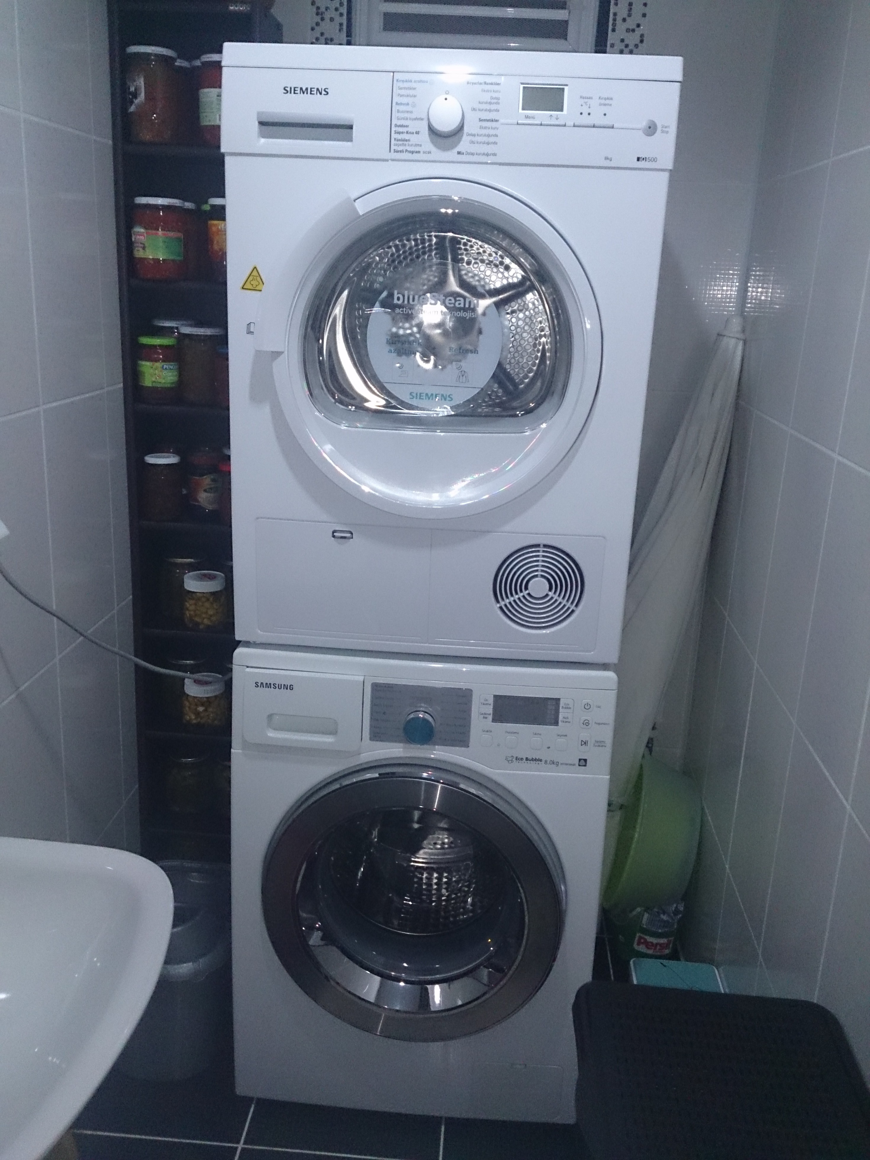 Samsung yıkayıcı ve kurutucuyu sütuna takma talimatları. Örneğin, giysi atma kapağı üste yerleştirilmişse, bunun üzerine. En kötü bir dolap yaptır çamaşır makinesi için sağlam olsun ama üzerine de koy kurutmayı ya da kurutma özellikli bir çamaşır makinesi al kurtul. Çamaşır makinesinin üstüne kurutma makinesi kurulumu nasıl yapılır? Gelişen teknoloji ile çamaşır kurutma cihazlarıda son derece gelişti ve artık lüks tüketimden çıkıp ihtiyaç haline geldi havaların. | creavit çamaşır ve kurutma makinesi dolabı banyonuza düzen getirecek. Ama bebeğin çamaşırlarını kurutmada kurutmuyorum malesef hemen çekiyorlar. Öncelikle çamaşır makinesinin arka panelinin üst köşelerinde bulunan vidalarla kilitlenir ve ancak daha sonra ikinci bir kişinin bize yardım etmesi için kurutucuyu çamaşır kurutma makinesini ve çamaşır makinesini üst üste istifleme. Şimdi güven ile üst üste en sevdiğiniz gömleği. Yanı camasır makınesıne attıgın biz de ikisi de ayrı, üst üste koyduk yıkananlar direk üstteki kurutmaya.